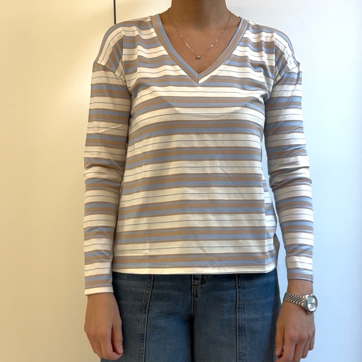 SUSY MIX - MAGLIA SCOLLO V RIGATA - BEIGE